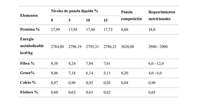 Nota: A medida que aumenta el nivel de inclusión de panela líquida en la dieta (hasta el 15 %), se ajustan las cantidades de maíz molido y aceite de palma para mantener una formulación balanceada en cada tratamiento.