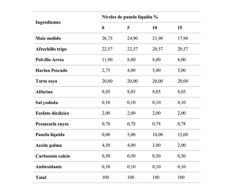 Los tratamientos consistieron en la inclusión de panela líquida en diferentes niveles en el balanceado: 5 % (T2), 10 % (T3) y 15 % (T4), mientras que el grupo control (T1) no recibió panela.