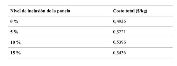Tabla 3: Costo total estimado por kilogramo de dieta en función de los niveles de inclusión de panela líquida en la ración de cuyes
