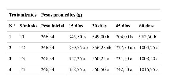 Nota: Letras diferentes en los valores indican diferencias estadísticas significativas entre tratamientos según la prueba de Duncan al 5 % (p<0,05). Letras iguales indican que no hay diferencias significativas. Los pesos iniciales corresponden al promedio de los 64 cuyes al inicio del experimento, con un valor general de 266,34 g.