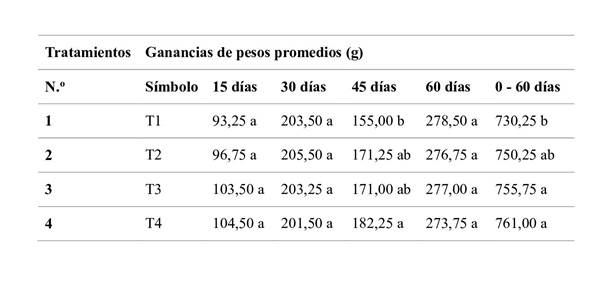 El análisis de covarianza presentó diferencias estadísticamente significativas (p<0,05) en el peso corporal de los cuyes a los 15, 30, 45 y 60 días, lo que indica que la inclusión de panela líquida influyó en el crecimiento de los animales (tabla 3). Sin embargo, la prueba de comparación múltiple de Duncan con un umbral de significancia de 0,05 aplicada a los pesos iniciales no detectó diferencias significativas entre los tratamientos, lo que confirma que los grupos de cuyes partieron de condiciones similares al inicio del experimento.