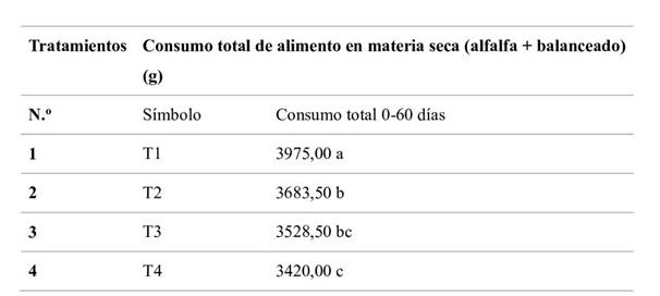 Los valores de consumo total de alimento en materia seca (alfalfa + balanceado) mostraron diferencias altamente significativas entre los tratamientos, T1 registró el mayor consumo (3975,00 g), mientras que T4 presentó el menor consumo (3420,00 g) (tabla6).