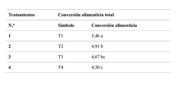 Los promedios generales de conversión alimenticia registrados durante los 60 días del experimento fueron 5,46 para T1, 4,91 para T2, 4,67 para T3 y 4,50 para T4. La prueba de significancia (p<0,05) en la conversión alimenticia (tabla7) reveló diferencias altamente significativas entre los tratamientos, se destaca a T4 como el de mejor conversión alimenticia, con un valor de 4,50, mientras que T1 presentó la peor conversión con 5,46.