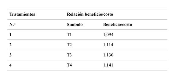 La tabla 8 presenta los resultados del análisis económico de la relación beneficio/costo para los cuatro tratamientos evaluados. Todos los tratamientos reportaron una relación mayor a 1,0, lo que indica que cada uno fue rentable. T4 presentó la mejor relación beneficio/costo con un valor de 1,141, seguido por T3 con 1,130, T2 con 1,114 y T1 con 1,094.
