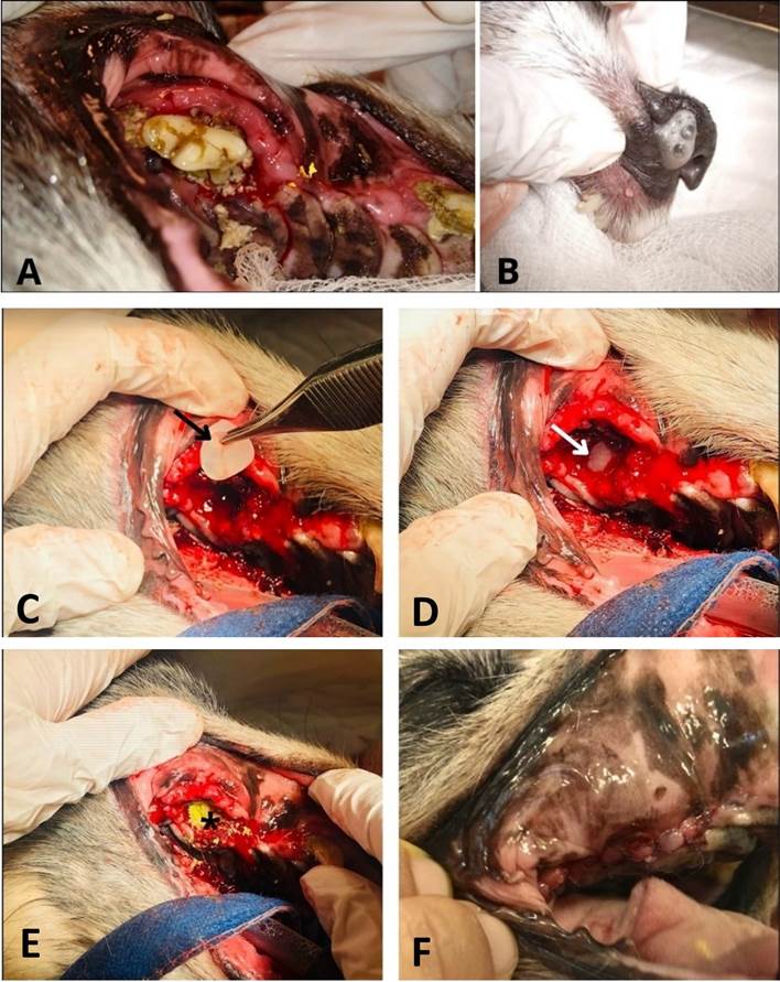 Figura 1: A: Inspección bajo anestesia del cuarto premolar superior derecho. Presencia de material purulento, retracción gingival, gingivitis y enfermedad periodontal grado 4. B: Secreción nasal de la narina derecha. C: Presentación de L-PRF en el defecto (flecha negra). D: Colocación de L-PRF (flecha blanca). E: Colocación de yodoformo (*). F: Cierre completo del colgajo mucoperióstico.