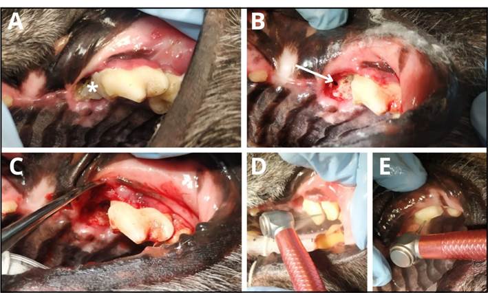 Figura 2: A: Inspección bajo anestesia del cuarto premolar superior izquierdo. Presencia de resina adherida a la corona (*), retracción gingival, gingivitis y presencia de material purulento. B: A la extracción de la resina se visualiza material purulento y presencia de FON (flecha blanca). C: Separación de la encía adherida al diente. D: Odontosección oblicua desde la bifurcación. E: Odontosección mesio-distal.