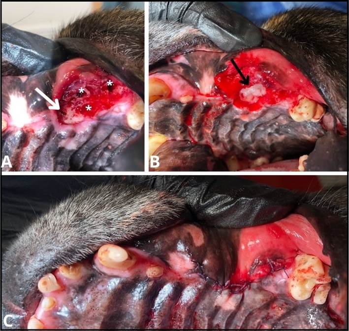 Figura 3: A: Defecto alveolar luego de la extracción de la resina y la exodoncia del cuarto premolar superior izquierdo. Se aprecia la FON (flecha blanca) y los alvéolos dentarios de cada raíz (*). B: Colocación de L-PRF (flecha negra). C. Cierre del colgajo mucoperióstico.
