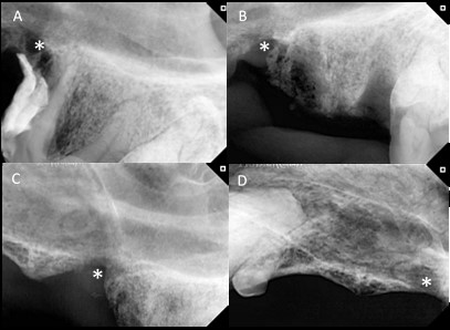 Figura 4: Radiografías correspondientes al caso 2. A: En la radiografía se visualizan restos de resina radiopacos sobre las raíces mesiales de la pieza 208 y pérdida ósea adyacente a los restos de resina (*). A su vez presenta disminución de la radiodensidad ósea del hueso alveolar entre las raíces mesiales y la distal. También se observa una discontinuidad en la tabla ósea compatible con fístula oronasal. B: Radiografía inmediata a la exodoncia de la pieza 208 y extracción de la resina. Se visualizan los espacios correspondientes a los alvéolos dentales vacíos y la rarefacción ósea con disminución de radiodensidad craneal a los alvéolos dentales compatible con osteomielitis (*). C: Radiografía correspondiente a la zona de la pieza 208, 3 meses luego de realizada la exodoncia y colocación de PRF, se observa una remodelación ósea con aumento de la radiodensidad ósea en la zona correspondiente al alvéolo de las raíces mesiales y en la zona correspondiente al defecto óseo generado por la resina (*). D: Radiografía a los 9 meses de la exodoncia y aplicación de PRF. Presenta una buena radiodensidad a nivel óseo en la zona correspondiente al defecto (*). Tomada del Servicio de Odontoestomatología de la Facultad de Veterinaria, Udelar.