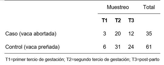 Se definió como caso toda vaca que hubiera abortado, es decir, aquellas vacías en T2 o que no hubieran parido en T3. En T1, si durante la visita se detectaba una vaca abortada, está también se incluía como caso. Por cada caso, se seleccionaron dos controles, dos vacas preñadas en ese mismo muestreo. Las vacas controles no se repetían en los diferentes muestreos: si una de ellas abortaba posteriormente, pasaba a considerarse caso y se excluía del grupo control. Asimismo, si una vaca control no estaba disponible para la verificación de la gestación en el muestreo siguiente, se eliminaba del grupo. Las muestras utilizadas para cada diagnóstico correspondieron a las tomadas en el muestreo en que se constataba el aborto.