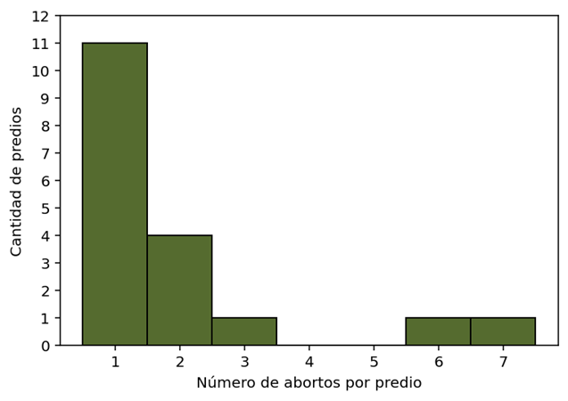 Figura 1: Distribución del número de abortos en predios ganaderos con al menos un aborto detectado durante el período 2020-2022