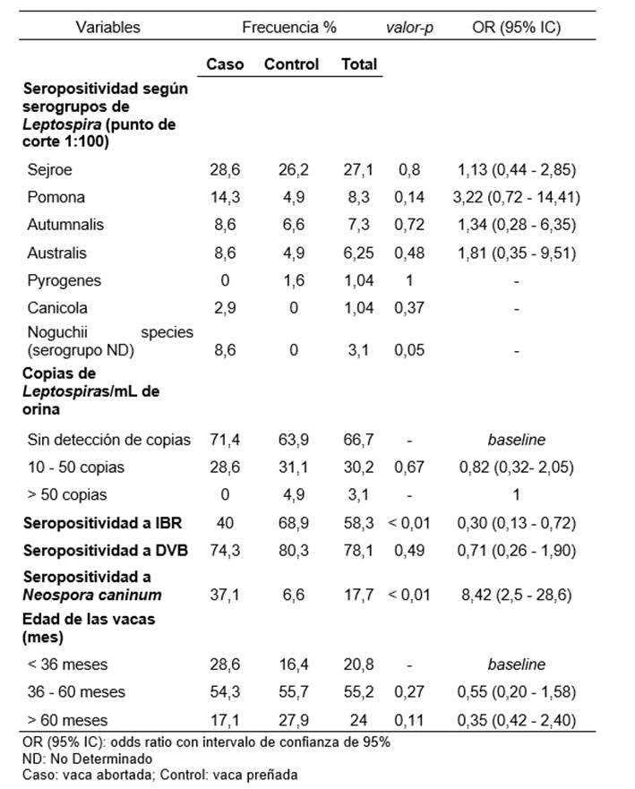 La leptospirosis es una reconocida zoonosis bacteriana causada por Leptospira spp. En bovinos, su ocurrencia suele estar más vinculada a afecciones reproductivas. Este estudio pretende determinar la asociación del aborto con la seropositividad de cepas locales y los niveles de excreción por orina de Leptospiras patógenas en vacas para producción de carne no vacunadas en Uruguay. Se llevó a cabo un estudio de casos y controles en 31 predios ganaderos sin antecedentes de vacunación contra leptospirosis de al menos un año. En cada predio, se realizó el seguimiento a 25 vacas preñadas de menos de tres meses de gestación. Se realizaron tres visitas a lo largo de la gestación de las vacas: dentro del primer tercio de gestación, dentro del segundo tercio de gestación y otra posparto. Se identificaron en cada visita las vacas abortadas, colectando muestras de sangre y orina a estas vacas y a dos compañeras por cada abortada. Se realizó diagnóstico serológico para Leptospira spp. (test de microaglutinación), rinotraqueítis infecciosa bovina, diarrea viral bovina y Neospora caninum (ELISA). Con las muestras de orina se hizo qPCR para la detección de Leptospiras patógenas. Se realizó una regresión logística teniendo en cuenta al predio como variable aleatoria. El análisis incluyó 35 vacas abortadas y 61 vacas controles. Las vacas abortadas tenían 8,06 veces más chance de ser seropositivas al serogrupo Pomona con respecto a vacas preñadas o que habían paridos un ternero a término (p = 0,01). Hubo una fuerte asociación con la seropositividad a Neospora caninum, las vacas abortadas tenían 11,31 veces más chance de ser seropositivas a este protozoario con respecto al grupo control (p < 0,01). Si bien se establece asociación entre la leptospirosis y el aborto en vacas de carne, se deberían realizar estudios más dirigidos para establecer con mayor precisión el impacto de esta enfermedad en sistemas ganaderos.