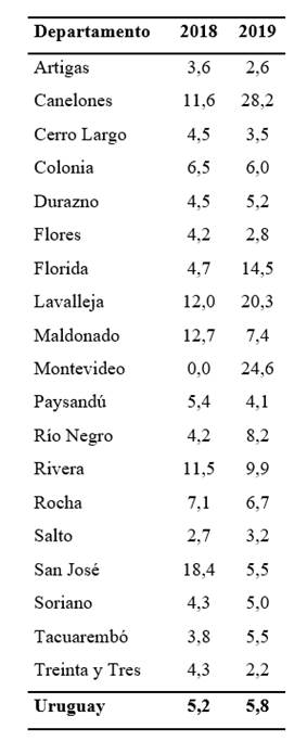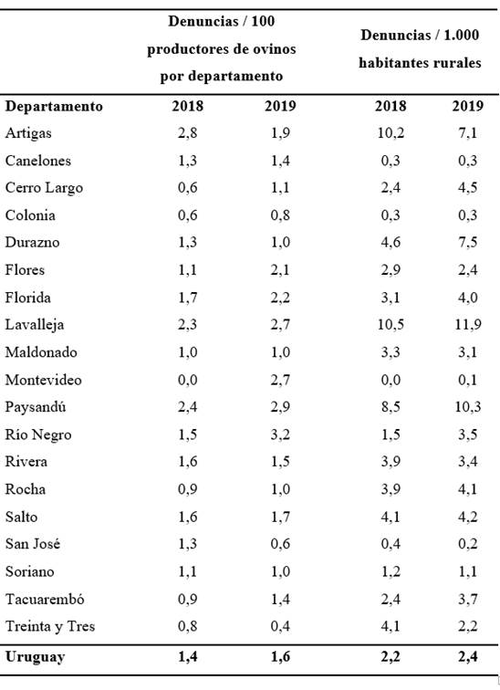 La media de denuncias por cada 1000 habitantes de zonas rurales fue de 2,2 en 2018 y de 2,4 en 2019. Los cuatro departamentos que encabezaron el índice (Lavalleja, Artigas, Paysandú y Durazno) mantuvieron niveles elevados al año siguiente, con un incremento en las denuncias. De estos, solo Lavalleja y Paysandú presentaron niveles altos de denuncias tanto en relación con el número de productores como con la población rural. El número de denuncias por productor con ovinos y por habitantes rurales en cada departamento se detalla en la tabla 1.