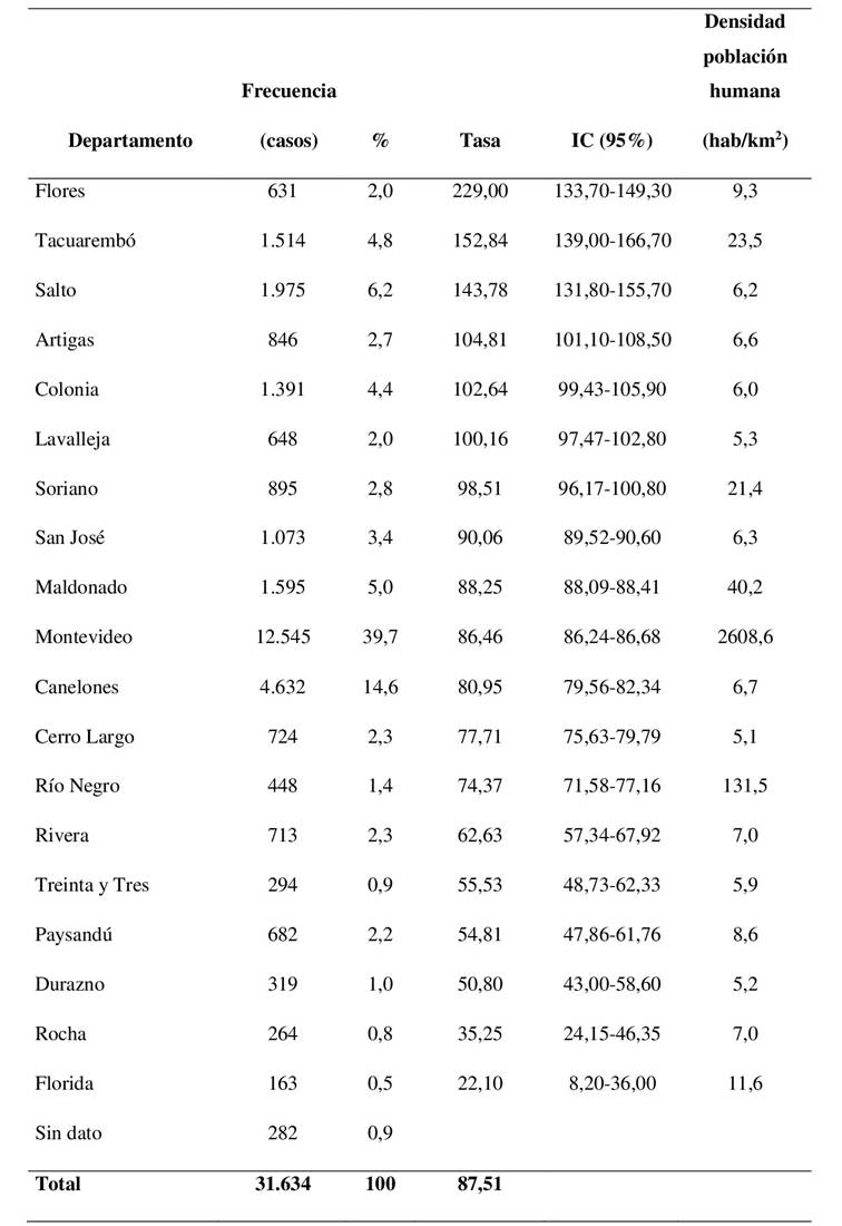La tasa de mordeduras por departamento presentó grandes variaciones en el período analizado (tabla 1). El valor mínimo se registró en Florida, con una tasa de 22,10/100 000 hab. (IC: 8,20-36,00) y el valor máximo en Flores, con una tasa de 229,00/100 000 hab. (IC: 198,90-259,10). En Montevideo y Canelones se encuentra la mayor cantidad de personas mordidas en términos absolutos (55 %), pero cuando se analiza en base a la tasa de mordidos se encuentran por debajo del promedio nacional (tabla 1).