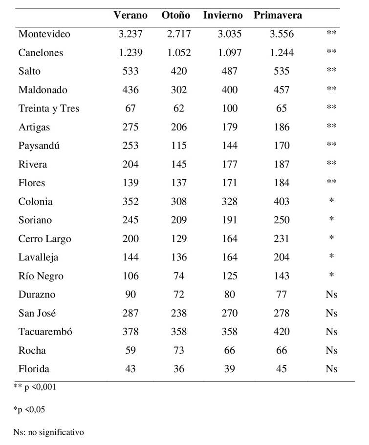 Hubo más personas mordidas en primavera en los departamentos de Montevideo, Canelones, Salto, Maldonado, Colonia, Soriano, Cerro Largo, Lavalleja, Flores y Río Negro (tabla 2). En verano se registraron mayor cantidad de personas mordidas en Artigas, Paysandú y Rivera; mientras que en Treinta y Tres se registró mayor cantidad de personas mordidas en invierno (tabla 2).