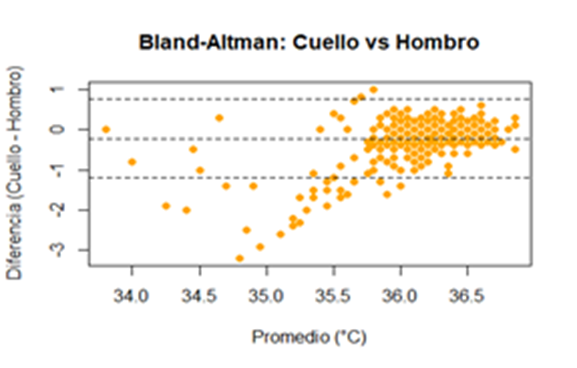 El gráfico 4 de Bland-Altman mostró un sesgo medio de -0,22 °C con límites de acuerdo inferior de -1,2 °C y superior de 0,76 °C para las diferencias entre la toma de cuello-hombro.