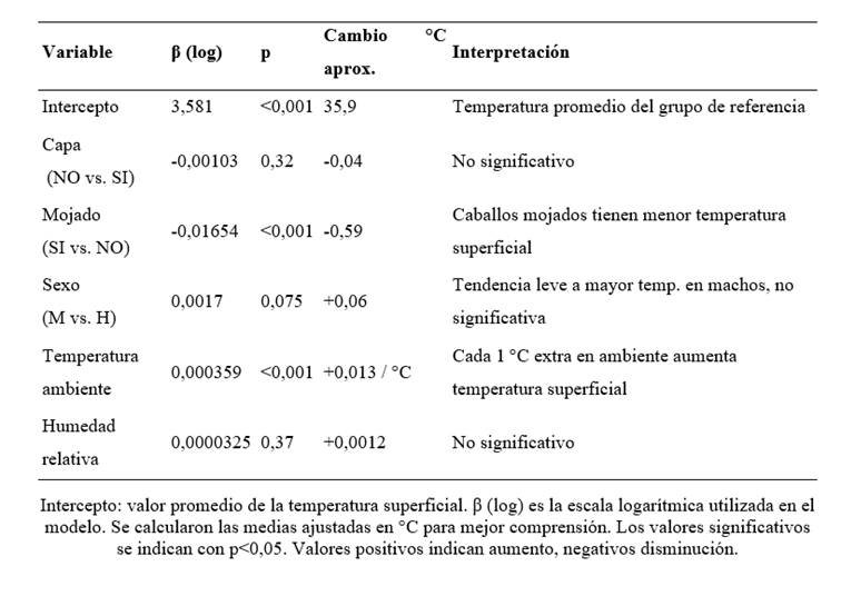 El modelo lineal mixto para las diferentes variables de efecto fijo (capa, mojado, sexo, humedad relativa y temperatura ambiente) y aleatorio (caballos) mostró una varianza entre caballos de 0,0000259 (SD=0,0051) y una varianza residual de 0,00006421 (SD=0,0080) (tabla 2 y tabla 3).