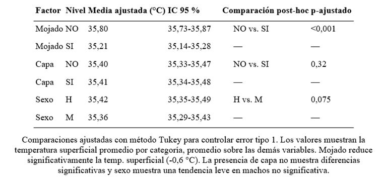 Tabla 3. Efecto de mojado, capa y sexo sobre la temperatura superficial