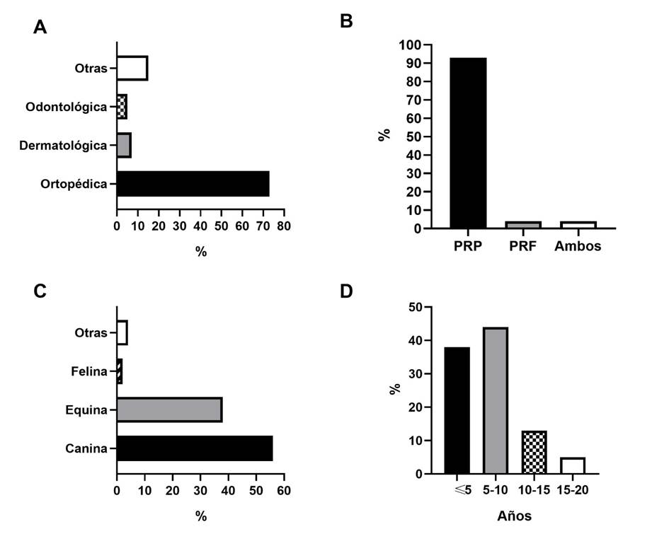 La casuística presentada en el período comprendido de 2018 a 2022 fue de 55 solicitudes de servicio con PDP. Estas fueron, principalmente, para el tratamiento de patologías ortopédicas (73 %), por ejemplo, para aplicarse en tendinopatías, desmopatías y osteoartritis. Mientras que patologías dermatológicas y odontológicas fueron <10 % (figura 1 A). Asimismo, el PDP autólogo más solicitado fue el PRP (93 %) y tanto el PRF como ambos tratamientos (PRP+PRF) fueron <5 % (figura 1 B). La especie predominante en las solicitudes fue la canina (56 %), seguida de la equina (38 %) y luego la felina (solo un 2 %), otras especies representaron el 4 %, que en este período en particular fueron especímenes de tortuga verde (Chelonia myda) (figura 1 C). Por otra parte, el rango etario con mayor frecuencia se ubicó entre 5 a 10 años de los animales (44 %), seguido por ≤5 años (38 %) (figura 1 D). Sin embargo, cuando se estudió cada especie encontramos que en caninos coincide con el rango etario general de 5 a 10 años donde existieron más solicitudes (43 %), en cambio en el rango etario para equinos fue más frecuente los ≤5 años (47 %).
