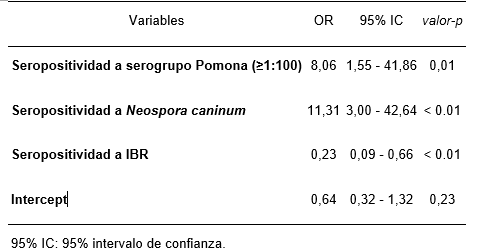 En el análisis multivariado tres variables conformaron el modelo final (tabla 3). Vacas abortadas presentaron odds 8,06 veces mayores de ser seropositivas al serogrupo Pomona, en comparación con vacas preñadas o que parieron un ternero a término. Por otro lado, se observó una fuerte asociación con la seropositividad a Neospora caninum: las vacas abortadas presentaron odds 11,31 veces mayores de ser seropositivas a este protozoario en comparación con el grupo control. Al evaluar posibles variables confusoras, se encontró que la inclusión de la variable seropositividad a IBR actuaba como un potencial factor de confusión en la asociación con la seropositividad al serogrupo Pomona. Las odds de seropositividad a Pomona aumentaban un 52 % al incluir esta variable, pasando de 5,29 a 8,06, por lo que se decidió mantenerla en el modelo final.