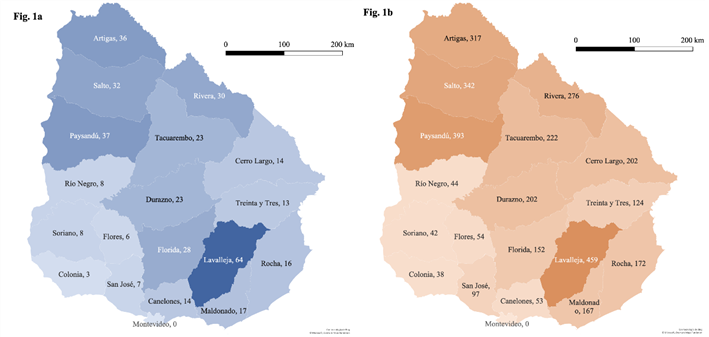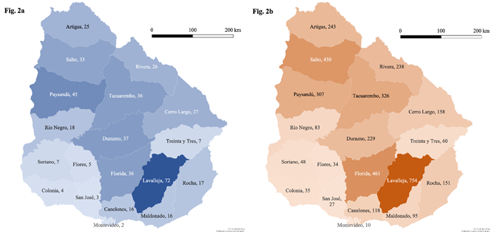 Para el año 2019, el 52 % de las denuncias se registró en el sur del país y el 48 % en el norte. También se constató una relativa concentración territorial en cinco departamentos, aunque con algunos cambios: Lavalleja, Paysandú, Durazno, Tacuarembó y Florida concentraron el 51,6 % de las denuncias. La mediana de estas por departamento fue de 18 animales (mínima = 2; máxima = 72). Los departamentos que registraron las frecuencias de denuncias más bajas para el año fueron Montevideo y San José (figura 2a).