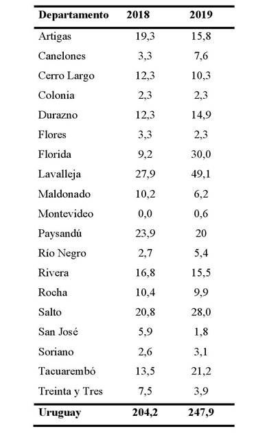 La media de denuncias por cada 1000 habitantes de zonas rurales fue de 2,2 en 2018 y de 2,4 en 2019. Los cuatro departamentos que encabezaron el índice (Lavalleja, Artigas, Paysandú y Durazno) mantuvieron niveles elevados al año siguiente, con un incremento en las denuncias. De estos, solo Lavalleja y Paysandú presentaron niveles altos de denuncias tanto en relación con el número de productores como con la población rural. El número de denuncias por productor con ovinos y por habitantes rurales en cada departamento se detalla en la tabla 1.
