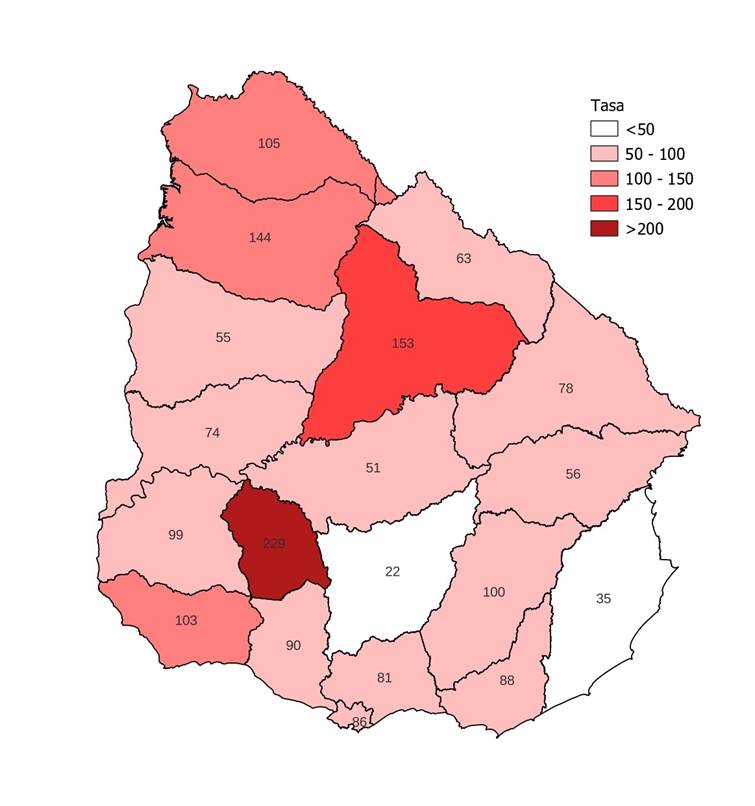 Figura 1. Tasas promedio de mordedura de perros cada 100 000 hab. en Uruguay, discriminadas por departamento durante el período 2010-2020