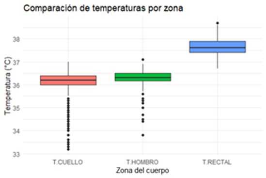 Gráfico 1: Comparación de temperaturas medidas en tres zonas del cuerpo (cuello, hombro y rectal). El gráfico de cajas muestra la distribución de las temperaturas para cada zona. La línea media en cada caja representa la mediana y los límites de caja representan el rango intercuartílico (20 al 75 %). Los puntos representan los valores atípicos y la dispersión general de los datos.