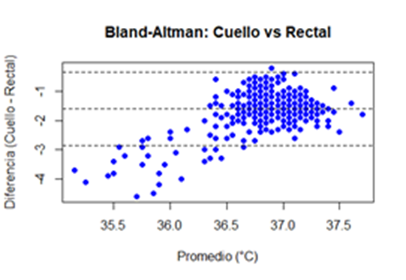 El gráfico 2 de Bland-Altman mostró un sesgo medio de -1,59 °C con límites de acuerdo inferior de -2,85 °C y superior de -0,33 °C para las diferencias entre la toma de cuello-rectal.