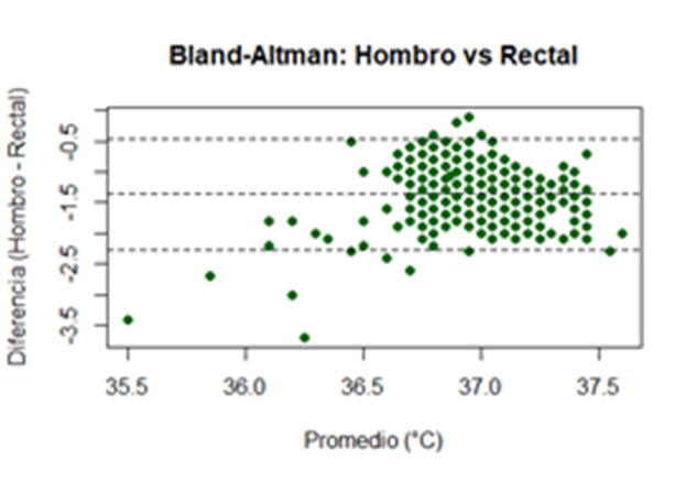 El gráfico 3 de Bland-Altman mostró un sesgo medio de -1,37 °C con límites de acuerdo inferior de -2,26 °C y superior de -0,47 °C para las diferencias entre la toma de hombro-rectal.