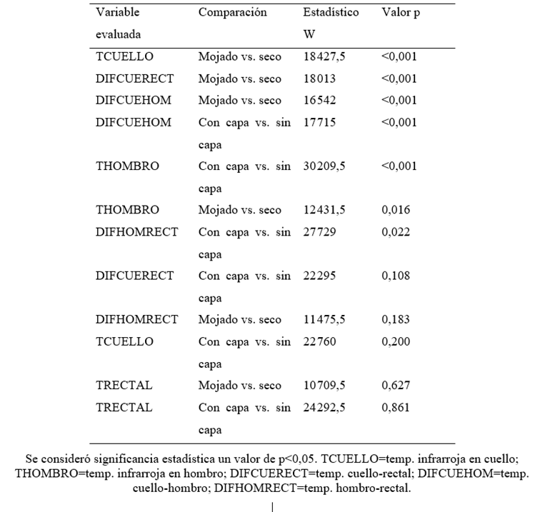 Tabla 1. Comparación de temperaturas entre dos grupos (mojado y capa) mediante la prueba de Wilcoxon/Mann-Whitney